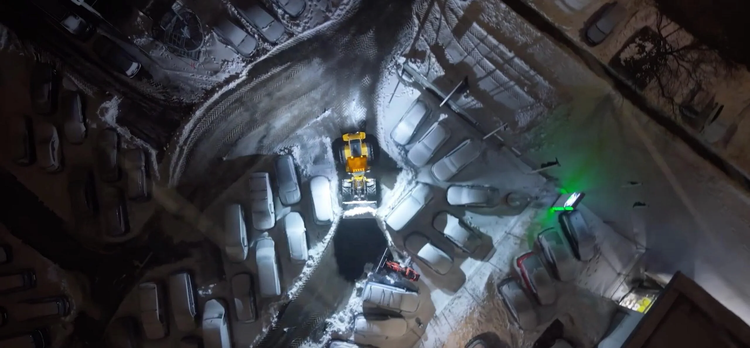 - En minilæsser, der trækker sneen fri mellem bilerne